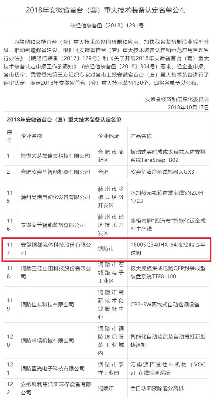 液控偏心半球閥榮獲“2018年安徽省首臺(tái)(套)重大技術(shù)裝備”…