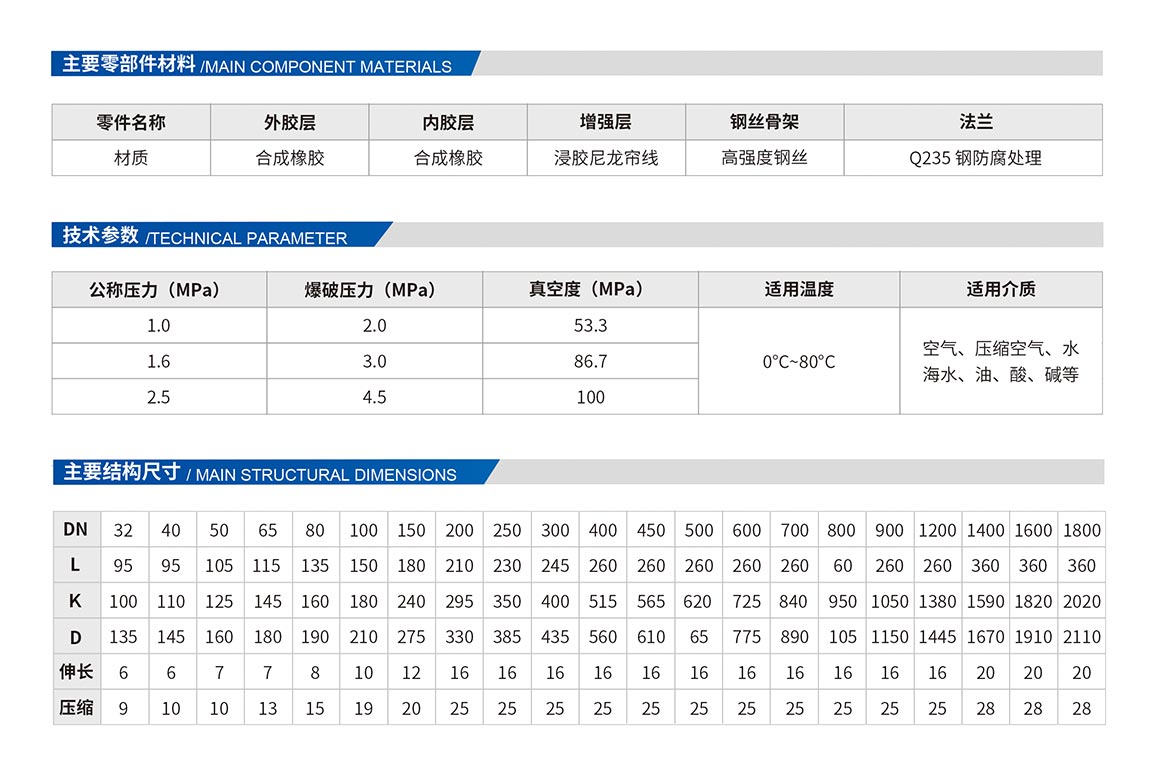 由織物增強(qiáng)的橡膠件,一般由內(nèi)膠層、織物增強(qiáng)層、鋼絲圈、外膠層經(jīng)硫化成橡膠件后與松套金屬法蘭組成,用于管道隔振降噪、補(bǔ)償位移的接頭??裳a(bǔ)償軸向位移、徑向位移和角向位移。具有耐壓高、彈性好、位移量大、平衡管道偏差、吸收振動、降低噪音效果好。